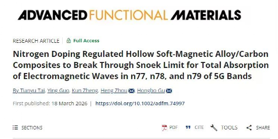 best365中国官方网站谷红波副教授团队与中国科学院化学研究所周恒研究员团队合作,近年来围绕低频电磁波吸收材料开展了系统性研究。团队通过氮掺杂调控中空软磁合金/碳复合材料(CoNi@NC)的电磁参数,成功构建了磁-介电协同损耗体系,显著提升了材料的fr和阻抗匹配性能,首次实现了对5G频段n77、n78和n79的全吸收。相关成果以“Nitrogen Doping Regulated Hollow Soft-Magnetic Alloy/Carbon Composites to Break through Snoek Limit for Total Absorption of Electromagnetic Waves in n77, n78, and n79 of 5G Bands(氮掺杂调控中空软磁合金/碳复合材料突破Snoek极限实现对5G频段n77、n78和n79电磁波的全吸收)”为题,发表于国际知名学术期刊《先进功能材料》(Advanced Functional Materials (2026): e74997)上。