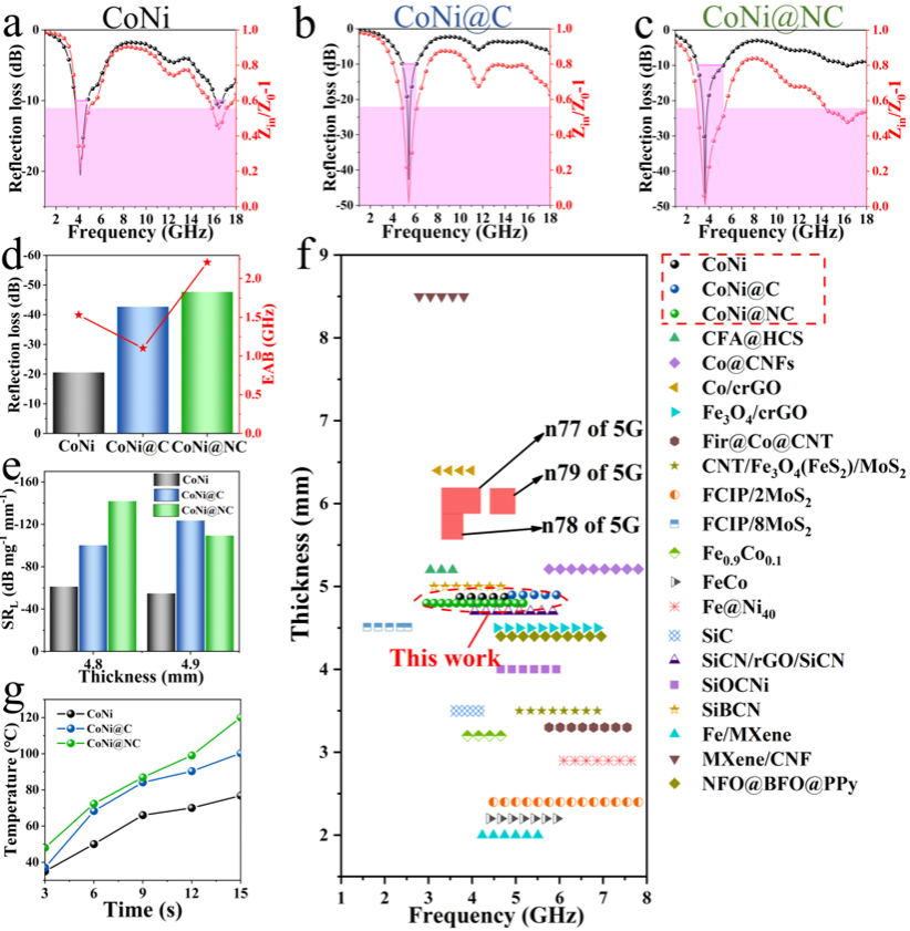 Figure 3. Comparison of CoNi, CoNi@C, and CoNi@NC. (a–d) Comparison of RLmin, EAB, and |Zin/Z0 –1|, (e) Comparison of SRL, (f) Performance comparison between this work and other low-frequency absorbers, (g) Comparison of heat transfer.