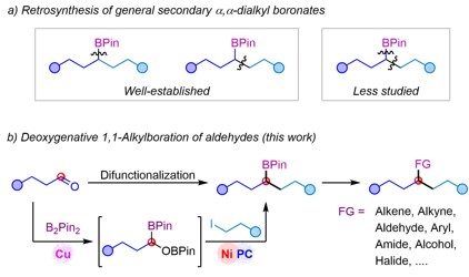 Xu Tao's research team achieves the efficient synthesis of secondary α,α-dialkyl boronates via deoxygenative alkylboration of aldehydes, publishing relevant outcomes in Angewandte Chemie International Edition.