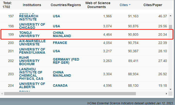 On January 12, 2023, Clarivate Analytics released the latest Essential Science Indicators (ESI) rankings.The data shows that Tongji University's (TJU) chemistry discipline continues to maintain its international ranking at 199, up 2 places from two months ago, entering the top 1.17‰ of the ESI ranking