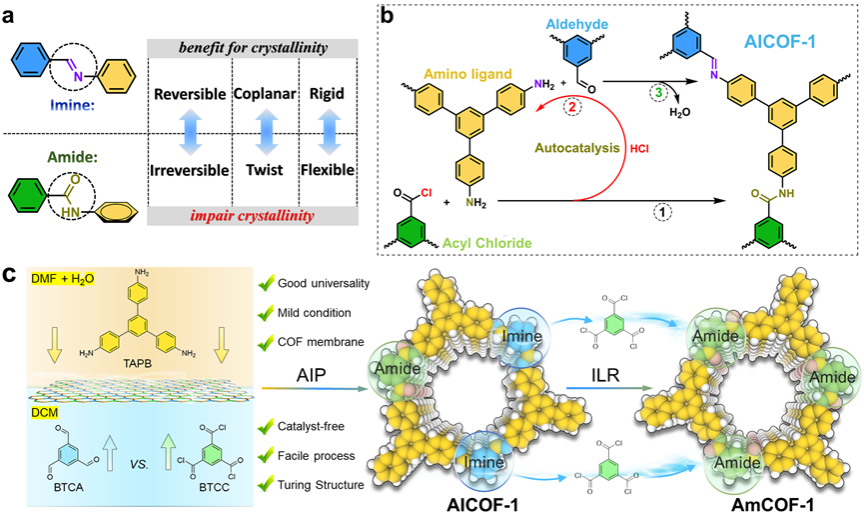 Graphical AbstractA universal two-step method based on autocatalytic interfacial polymerization (AIP) has enabled the synthesis of irreversibly amide-linked COF (AmCOF) membranes with Turing structures. The representative AmCOF-1 membrane with its built-in robust amide knots exhibits a good performance for H2O2 photosynthesis (4353 μmol g−1 h−1) and high stability, enabling continuous pro...