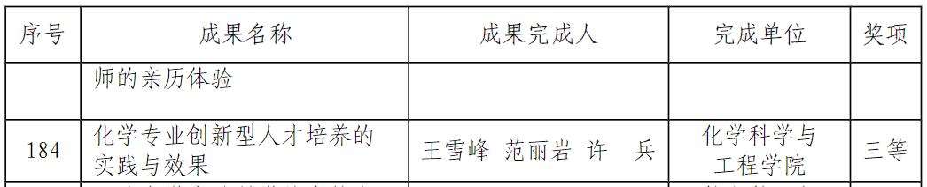 王雪峰、范丽岩、许兵团队的项目《化学专业创新型人才培养的实践与效果》获得三等奖。