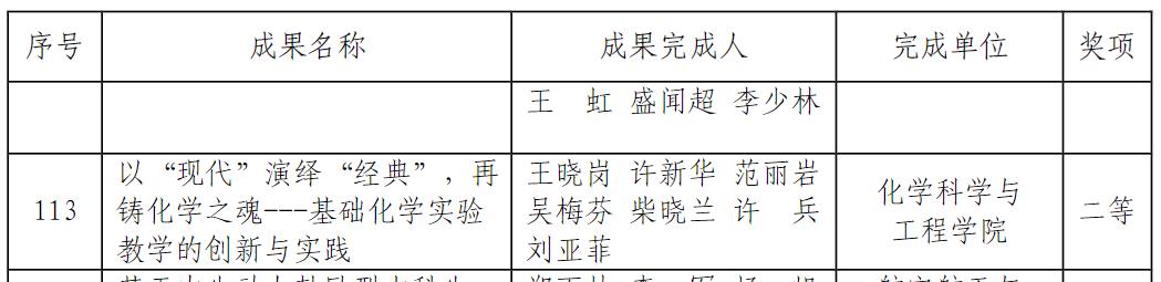 王晓岗、许新华、范丽岩、吴梅芬、柴晓兰、许兵、刘亚菲团队的项目《以“现代”演绎“经典”,再铸化学之魂——基础化学实验教学的创新与实践》获得二等奖。