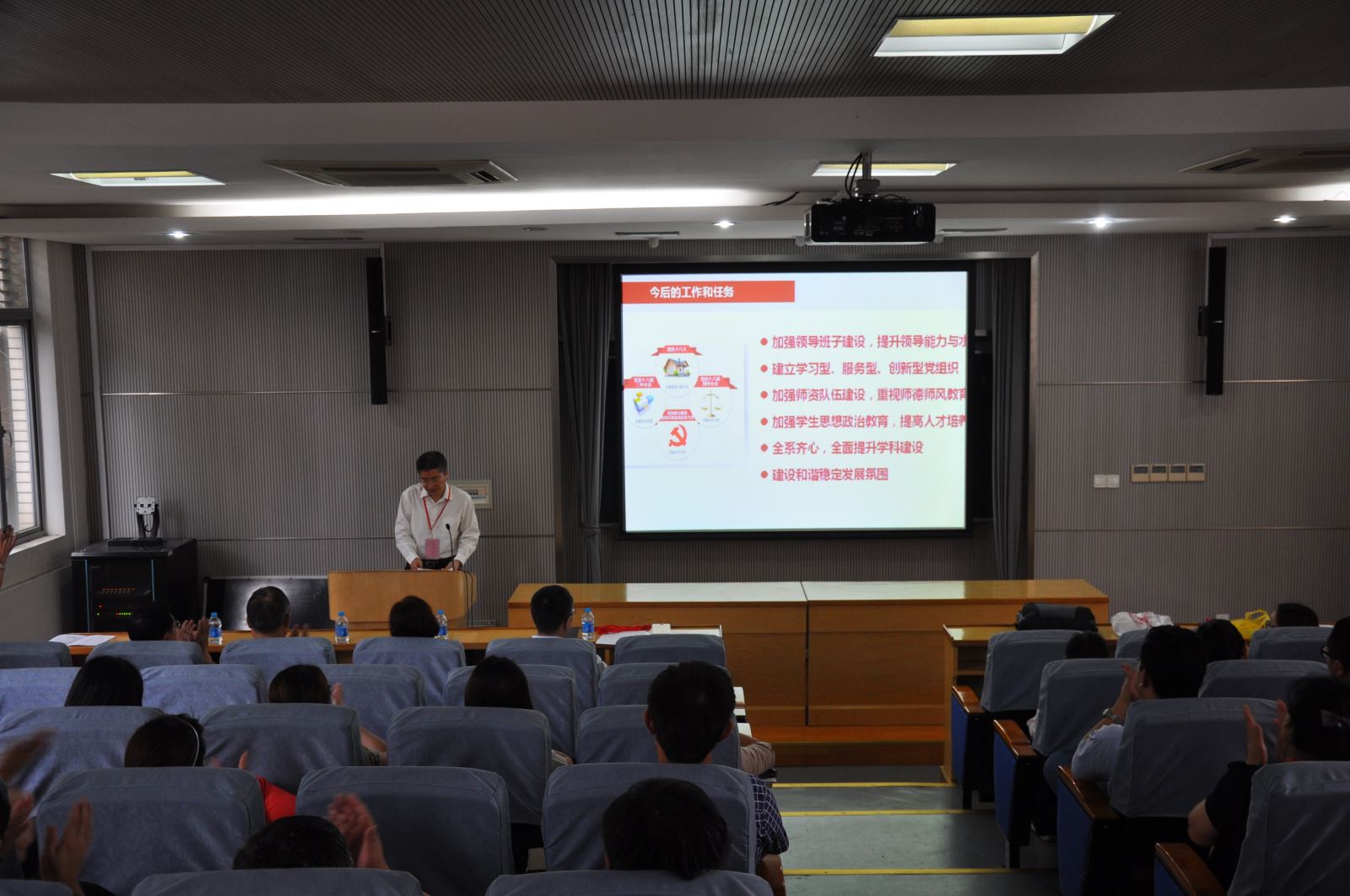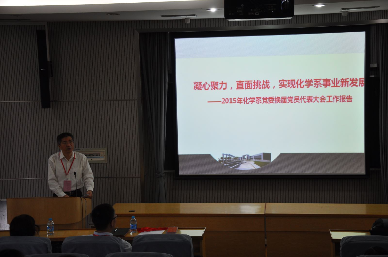 系党委书记王国强同志代表上届中共best365中国官方网站化学系委员会向大会作题为《凝心聚力、直面挑战,实现化学系事业新发展》的工作报告。报告客观地回顾了上届系党委(党总支)过去五年的工作:一是加强党的建设,引领和谐、可持续发展,分别从切实加强组织建设、认真组织学习活动、重视党风廉政建设、重视民主管理等方面介绍了过去五年的党建情况。二是加强内涵建设,推动事业发展,就加强团队队伍建设、加强团队建设、提高办学层次、重视本科教学提高教学质量和国际化办学特色逐步加强几个方面分别概述。三是重视宣传思想工作,加强全员育人工作,指出化学系过去五年注重员工工作实效,不断强化团学活动特色,逐渐提升宣传工作水平,营造了良好的全员育人氛围。