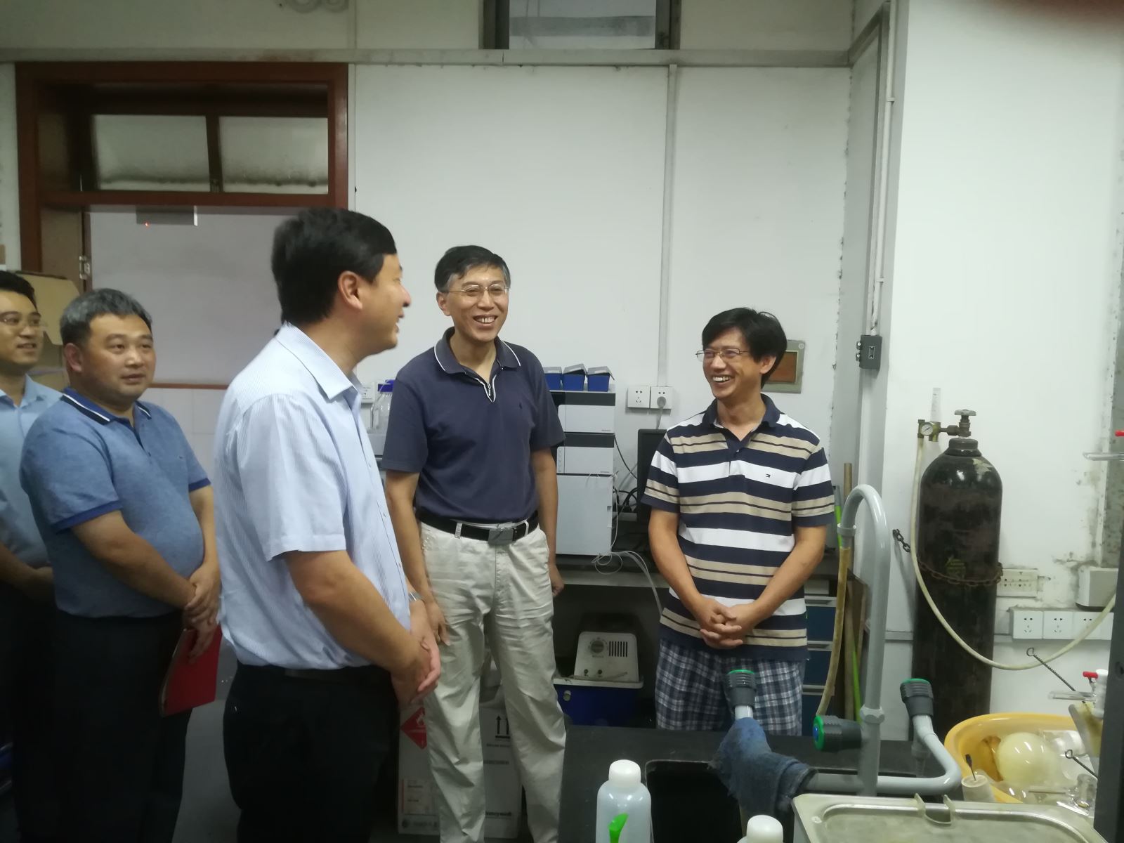陈董事长一行首先来到化学馆参观了化学化工实验教学示范中心,现场与实验室负责教师交流、了解部分大型仪器设备的运行情况;陈董事长先后走进田志新、张扬会等教授的实验室,听取各位责任教授科研工作情况的介绍,并与仍在实验室工作的师生亲切交流;陈董事长一行还来到化学公共实验室,了解学院教师面向全校开设理论课程和实验课程的情况。
