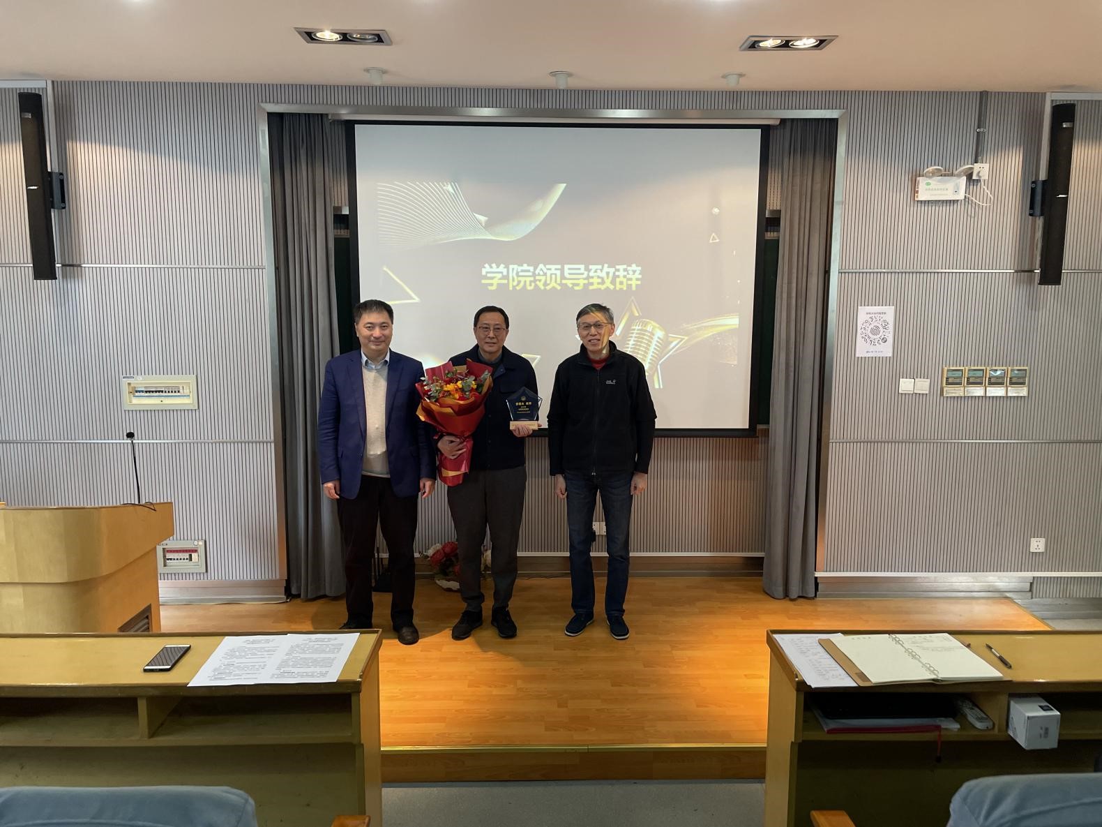 随后,党委书记曹同成和张弛分别为邹蓉夫老师颁发奖杯、敬献鲜花。邹蓉夫作为退休教师代表发表感言,他感谢全院师生的关心,回顾自己四十年的职业生涯,感恩自己与改革开放新时期同成长共进步,迎接中国进入新时代,倍感幸福和光荣。