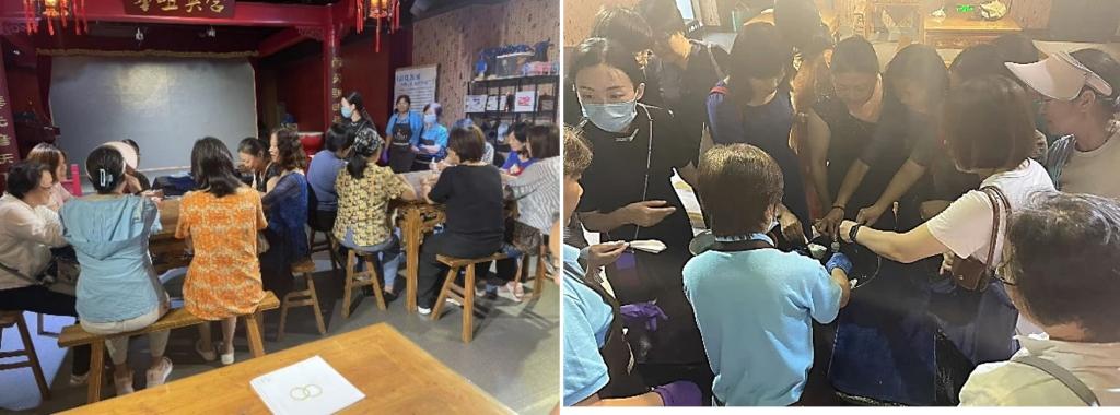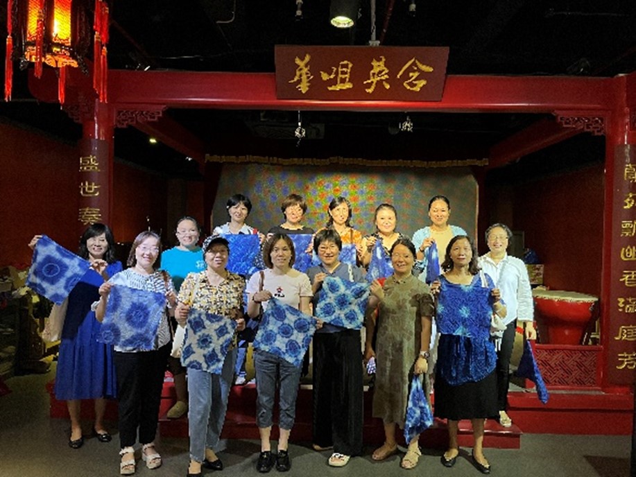 随后,老师们参加了传统工艺——扎染的体验课。扎染,又称扎缬、绞缬、夹缬和染缬,是国家级非物质文化遗产,是中国民间一种传统而独特的染色工艺。老师们通过“手作扎染”课程学习,在纺博馆老师的教学指导下,学习了解夹缬的技巧,动手获得了一块专属于自己的夹缬手帕,体验了中国传统天然植物染料手工扎染和夹缬,感受传统布艺的魅力。