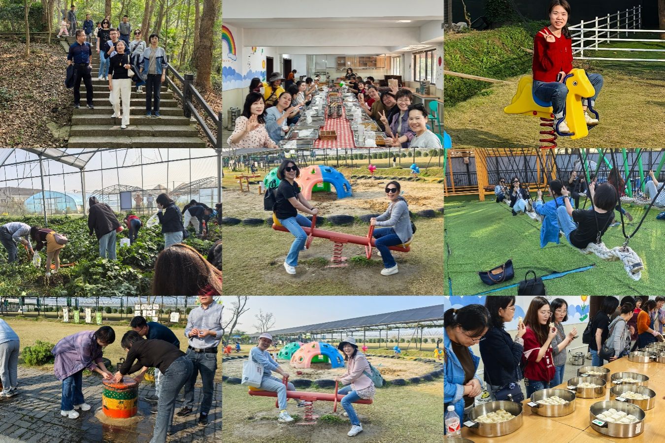 此次行程我们安排了丰富多彩的活动项目。上午爬山,中午品尝美味的农家菜,下午在吾舍农场采摘瓜果蔬菜、做香喷喷的桂花糕,还体验了儿童游乐设施:几人一起荡多人秋千、滑滑梯、坐跷跷板,大家一边玩,一边交流,每个人脸上都洋溢着幸福的笑容,感觉大家顷刻间都回到了童年,抛却了烦恼和忧愁,使平时紧张的心情得到了彻底的放松。