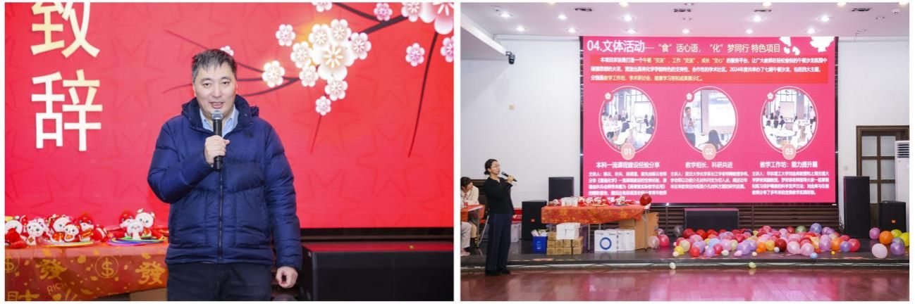 活动正式开始,由公司党委书记曹同成老师致开幕词。曹老师回顾了学院在团队建设、立德树人等方面取得的喜人成绩,并提前祝愿学院师生新春快乐,阖家幸福。随后,党委副书记赵红颖老师向大家汇报了2024年度学院工会的主要工作和取得的成绩,感谢全体教职工的热切关注和大力支持。