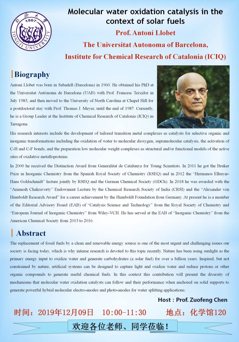报 告 人:Prof. Antoni Llobet ( The Universitat Autonoma of Barcelona, Institute for Chemical Research of Catalonia (ICIQ) )
