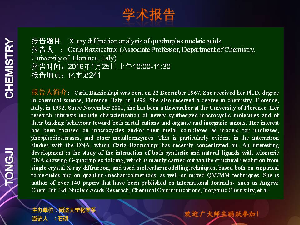 报告人简介:Carla Bazzicalupi was born on 22 December 1967. She received her Ph.D. degree in chemical science, Florence, Italy, in 1996. She also received a degree in chemistry, Florence, Italy, in 1992. Since November 2001, she has been a Researcher at the University of Florence. Her research interests include characterization of newly synthesized macrocyclic molecules and of their binding behaviour toward both metal cations and organic and inorganic anions. Her interest has been focused on macrocycles and/or their metal complexes as models for nucleases, phosphodiesterases, and other metalloenzymes. This is particularly evident in the interaction studies with the DNA, which Carla Bazzicalupi has recently concentrated on. An interesting development is the study of the interaction of both synthetic and natural ligands with telomeric DNA showing G-quadruplex folding, which is mainly carried out via the structural resolution from single crystal X-ray diffraction, and used molecular modellingtechniques, based both on empirical force-fields and on quantum-mechanicalmethods, as well on mixed QM/MM techniques. She is author of over 140 papers that have been published on International Journals,such as Angew. Chem. Int. Ed, Nucleic Acids Reserach, Chemical Communications, Inorganic Chemsitry, et.al.