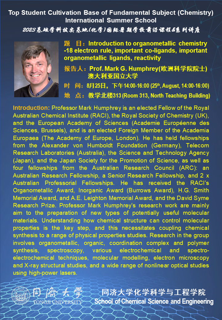 (8月25日)Prof. Mark Humphrey:Introduction to organometallic chemistry - 18 electron rule, important co ligands, important organometallic ligands, reactivity