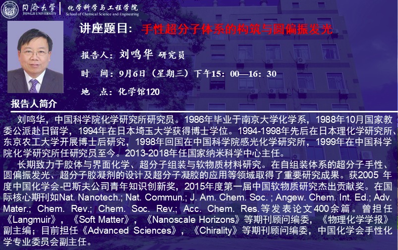 (9月6日)刘鸣华 研究员:手性超分子体系的构筑与圆偏振发光