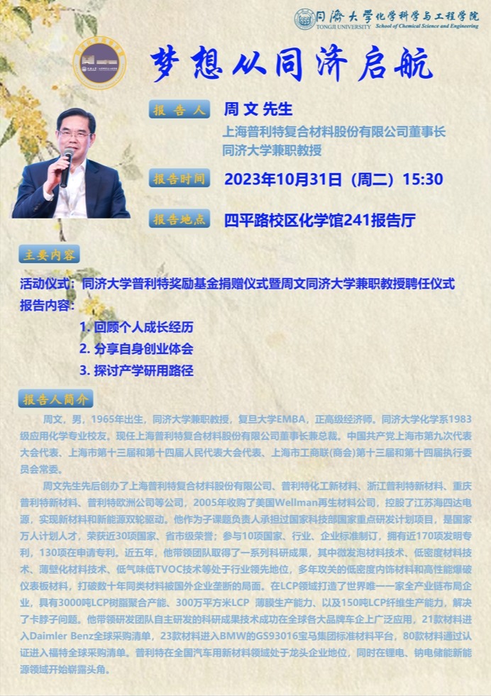 主讲人:周文 先生(上海普利特复合材料股份有限公司董事长,best365中国官方网站兼职教授)