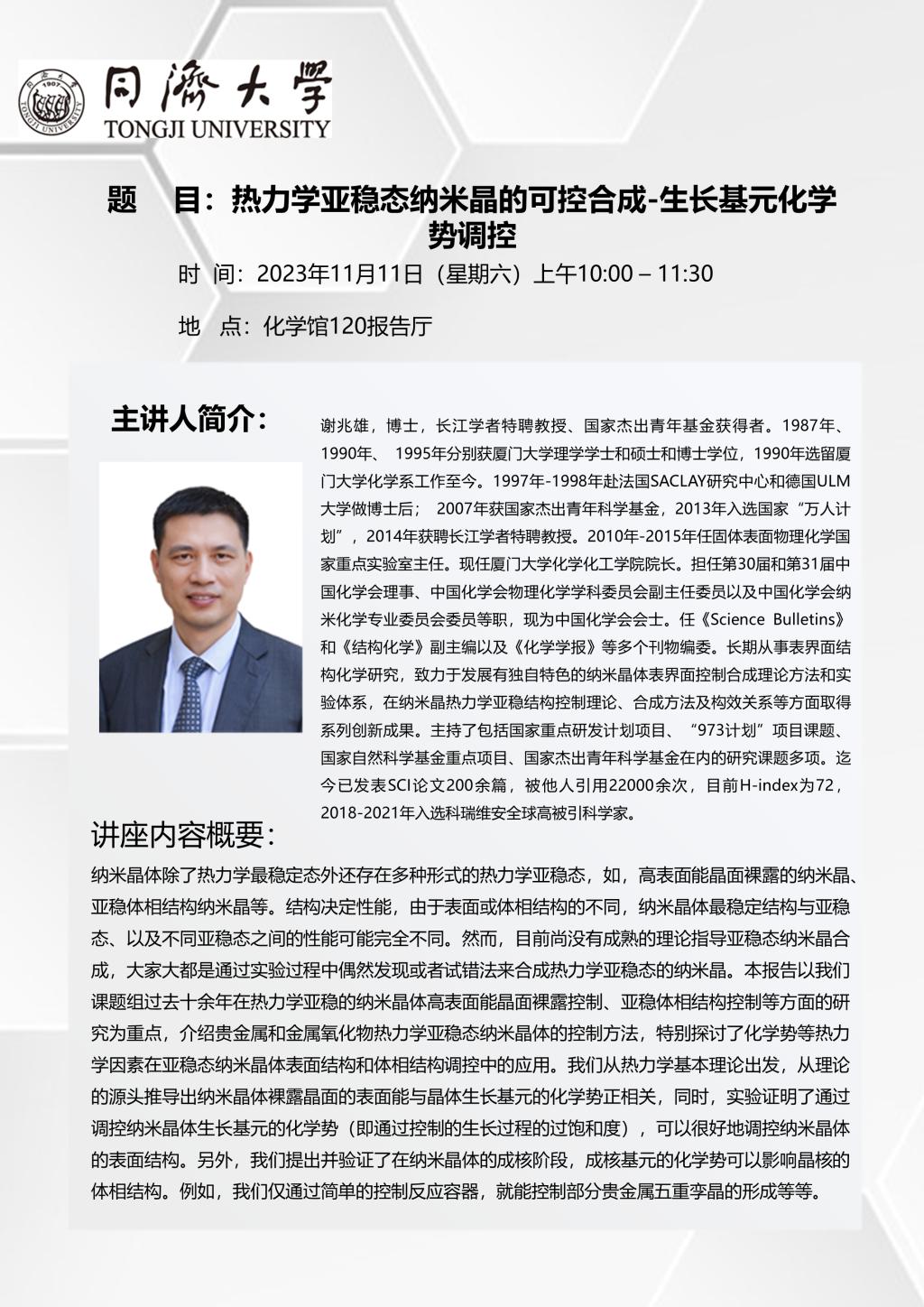 主讲人:谢兆雄 教授(厦门大学化学化工学院经理,教育部特聘教授、国家杰青)