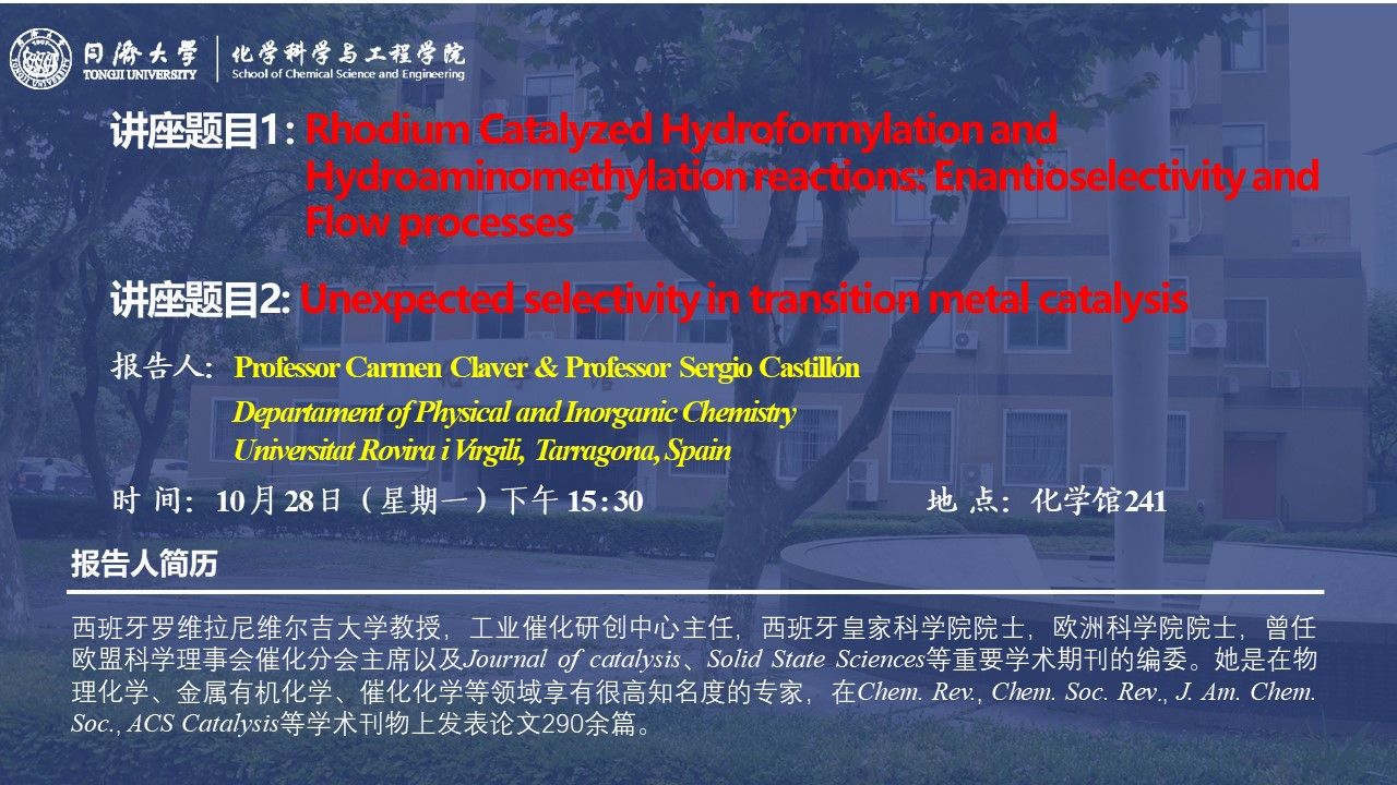 报告人1: Professor Carmen Claver (Departament of Physical and Inorganic Chemistry,Universitat Rovira i Virgili,Tarragona, Spain)