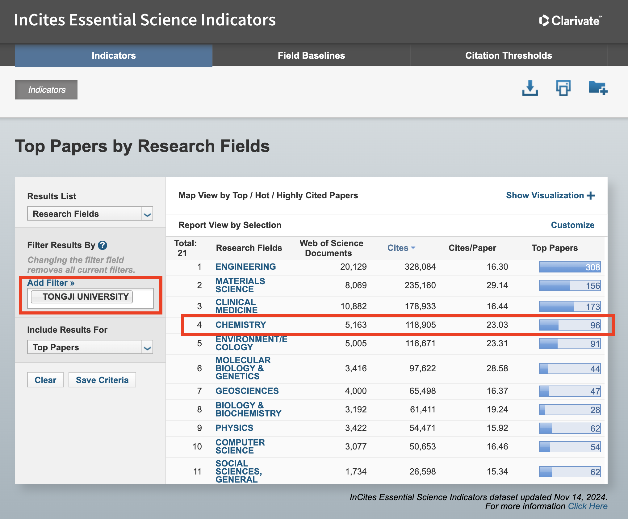 2024年11月14日,科睿唯安(Clarivate)发布最新一期(2024年11月)《基本科学指标数据库》(Essential Science Indicators,简称ESI)统计数据。