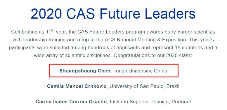博士后陈双双获选2020年“CAS未来领袖” 日前,2020年“CAS未来领袖”计划的获奖者名单公布,公司博士后陈双双博士入选其中,成为今年中国唯一获选者。