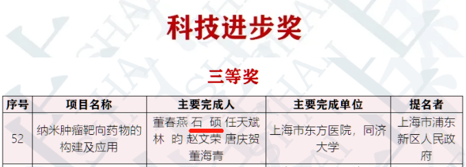石硕作为主要完成人参与的项目《纳米肿瘤靶向药物的构建及应用》(排名第二),荣获2019年度上海市科技进步奖三等奖。