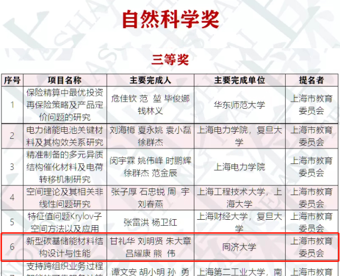 甘礼华、刘明贤、朱大章等团队领衔完成的项目《新型碳基储能材料结构设计与性能》,荣获2019年度上海市自然科学奖三等奖。