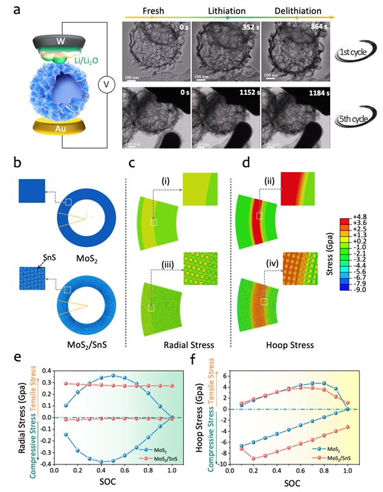 二硫化钼共价组装超结构用于锂/钠离子电池 —— 为解决二维层状材料能源应用中的固有问题提供了一种新策略 发展高性能、资源丰富和环境友好的储能技术是解决当前能源和环境危机,实现可持续发展的重要保障。由于具有较大的层间距和较高的理论储能容量,二维层状结构材料被认为是新一代高性能二次离子电池理想的电极材料。然而,二维材料层间典型的弱范德华力作用,使得电子不能垂直于片层进行跨层传输,降低了材料整体的电子传输效率;并且在离子反复脱嵌过程中层状结构也容易破坏,最终造成电池性能的严重劣化。 日前,公司杨金虎教授、张弛教授和复旦大学的车仁超教授合作,以典型的层状材料二硫化钼为研究对象,通过设计一种全新的共价组装策略,构建了二硫化钼超薄纳米片与硫化亚锡纳米点以共价键组装的中空超结构用于高性能的锂/钠离子电池。相关成果以“Covalent Assembly of MoS2Nanosheets with SnS Nanodots as Linkages for Lithium/Sodium‐Ion Batteries”为题发表在Angew. Chem. Int. Ed.(2020, doi/10.1002/anie.202005840)上。 二硫化钼层间共价组装超结构在锂/钠离子电池的应用中具有独特优势。首先,硫化亚锡以纳米点的形式均匀锚定在二硫化钼片层之间,增强了片层间的作用力,赋予材料结构以高的机械稳定性。其次,构建的层间共价键为电子在片层间的垂直传输提供了通道,提高了材料整体的电子传输效率。同时,DFT 理论模拟计算也表明该结构可有效降低锂离子的扩散迁移势垒,有利于电化学反应的快速发生,从而有利于电池倍率性能的提高。最后,通过原位电镜和力学计算分析,二硫化钼层间共价组装超结构可有效缓解锂离子嵌入时产生的应力,使循环过程中结构保持不破坏。最终,该共价组装超结构在锂/钠离子电池应用中表现出高的比容量,优异的倍率性能和良好的循环稳定性。该工作为解决二维层状材料能源应用中的固有问题提供了一种新策略。