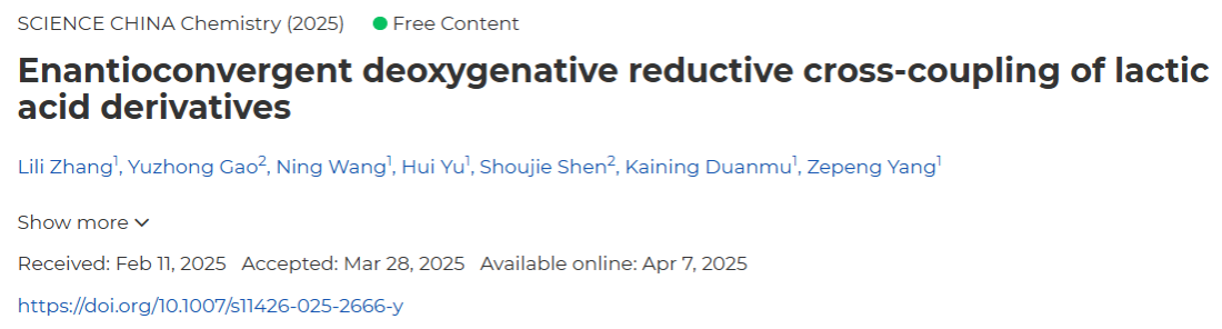 近日,best365中国官方网站杨泽鹏课题组基于丰产金属催化不对称偶联反应的研究兴趣(J. Am. Chem. Soc. 2024, 146, 9404−9412; Nat. Commun. 2024, 15, 2733),使用NHC活化策略实现了镍催化乳酸衍生物的对映收敛脱氧还原偶联反应,相关研究成果“Enantioconvergent Deoxygenative Reductive Cross-Coupling of Lactic Acid Derivatives”在线发表于国际知名期刊《中国科学:化学》(Science China Chemistry)。