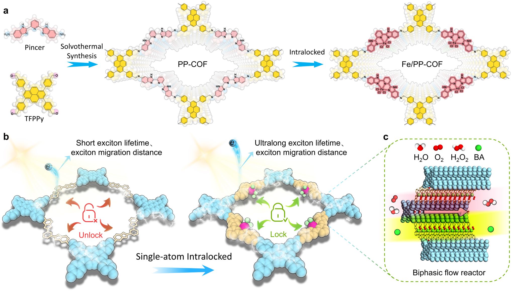 该研究提出一种普适性单原子封装策略,通过将一系列过渡金属原子精准锚定在钳形结构中,实现PP-COF的平面锁定并增强其π共轭效应。其中Fe原子锚定的Fe/PP-COF具有极高的单原子稳定性,展现出卓越的激子迁移距离(6.48−53.20 nm)与激子寿命(296.75 ps),为当前单原子COF材料的最高水平。在新型双相流动反应器中,该体系可实现连续60小时光合成产H2O2,速率达1556 µmol h−1,并保持产生的H2O2浓度高达100 mM,且无单原子流失。该研究为开发单原子COFs材料及精准调控单原子实现高时空效率连续H2O2光合成提供了重要范式。