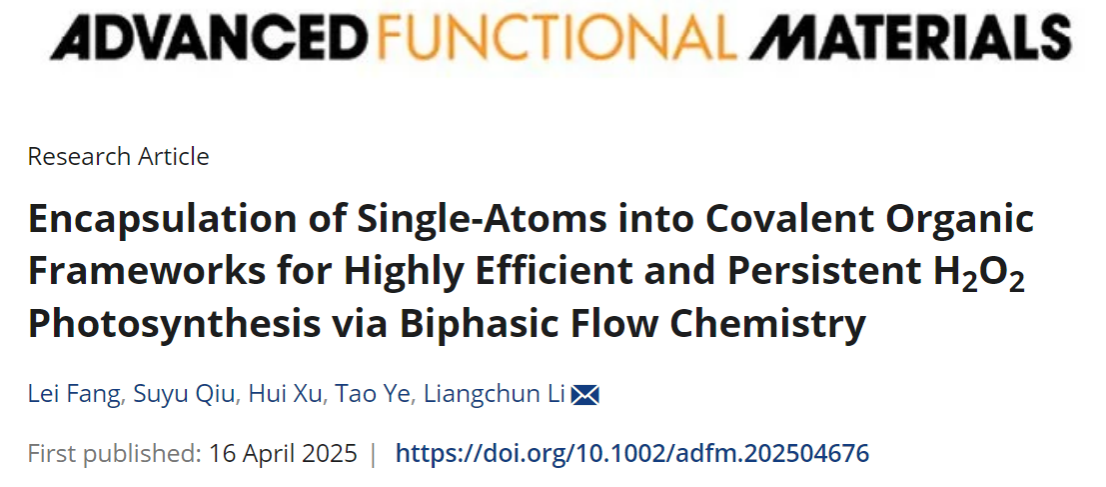 best365中国官方网站李良春教授课题组提出了COFs中的单原子封装策略,实现了高度平面共轭的MCOFs的普适性制备,并在自制的双相流动光合成H2O2中展现出优异性能,相关研究成果近日以“Encapsulation of Single-Atoms into Covalent Organic Frameworks for Highly Efficient and Persistent H2O2 Photosynthesis via Biphasic Flow Chemistry”为题发表于化学领域知名期刊《先进功能材料》(Advanced Functional Materials)。