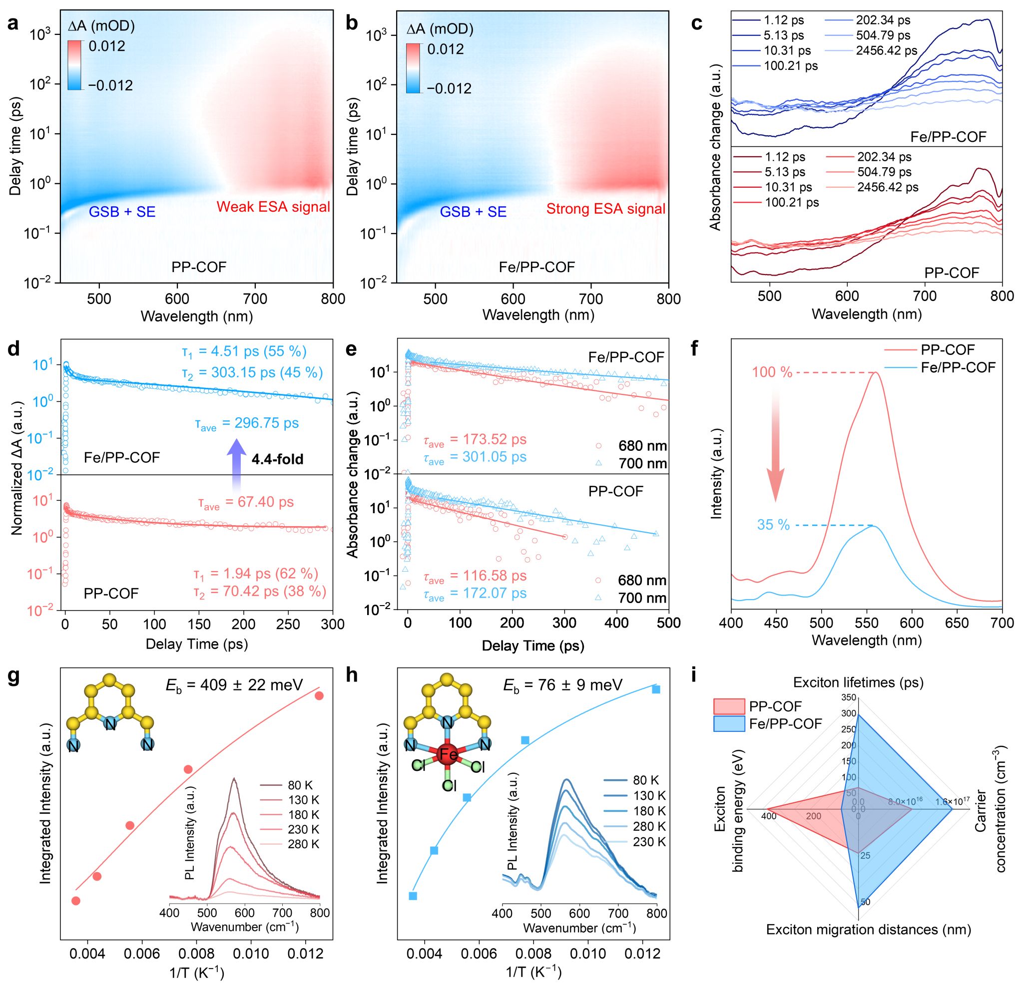 在材料结构设计过程中,通过有机合成制备了具有钳形三齿螯合结构的配体并整合到具有sql拓扑结构的PP-COF中,进而后修饰三齿螯合配位Fe单原子实现Fe/PP-COF的合成,通过Fe单原子有效调控COFs的光激子行为。