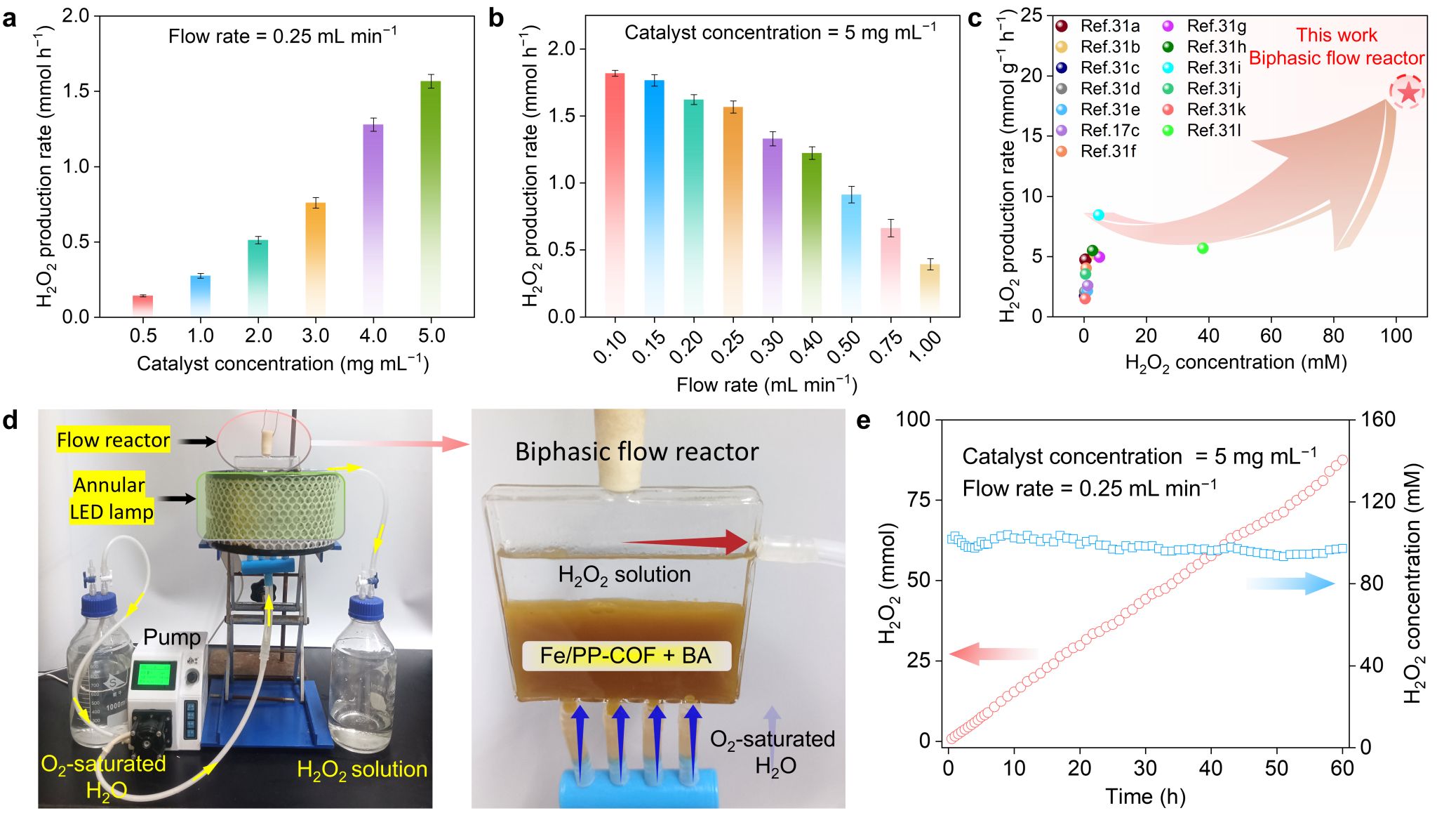 利用牺牲剂苯甲醇与水分层且密度比水大,设计的简易双相流动光反应装置在最优条件(0.25 mL min-1流速,5.00 mg mL-1催化剂浓度)下进行60小时连续实验,所产的H2O2浓度始终维持在约100 mM,显著高于现已报道的COFs光催化产H2O2体系。这种高性能源于Fe/PP-COF中单原子锁定结构的稳定性与卓越的激子寿命。