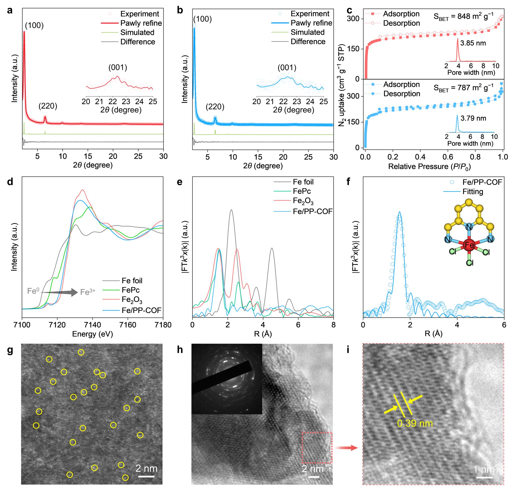 通过PXRD、XAFs、N2等温吸附、球差电镜、高分辨TEM等表征手段证明了PP-COF和单原子Fe/PP-COF的成功制备。其中,Fe/PP-COF表现出高度的单原子分散性,且与配体上钳形单元呈现特殊的三齿配位结构。
