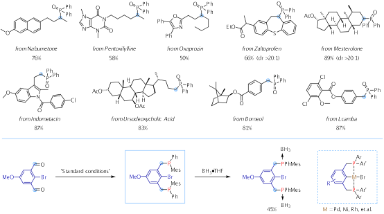 利用这种路易斯酸介导的三价膦Phospha-Brook重排反应,可以方便的实现烷基醛,芳基醛,直链烷基酮,环烷基酮和芳基酮的去氧氢膦化,其均能以良好的收率得到目标产物。同时,该反应具有优异的官能团兼容性,对于一些复杂的药物分子同样可以通过该方法进行后期修饰。利用这种方法,以二醛作为底物也可以快速合成一类三齿膦配体。