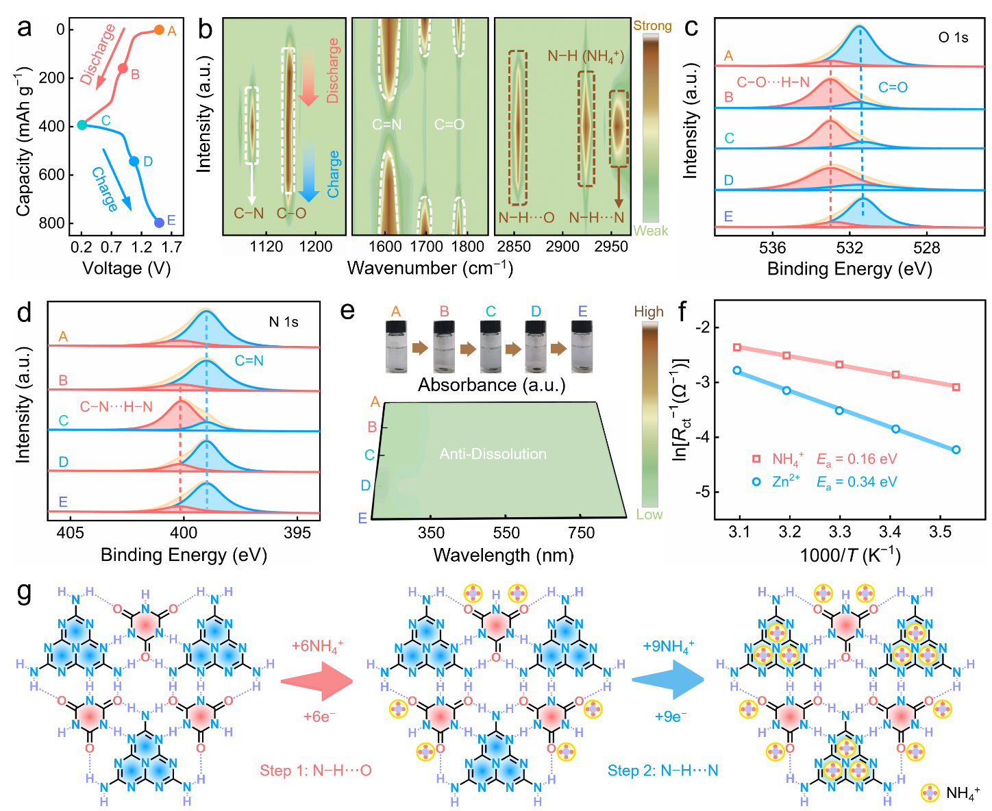 异位光谱研究表明,OSs电极高度稳定的氢键超结构能有效抑制活性官能团溶解,在超低活化能下充分利用羰基/亚胺基团实现稳定的两步15 e− NH4+配位。