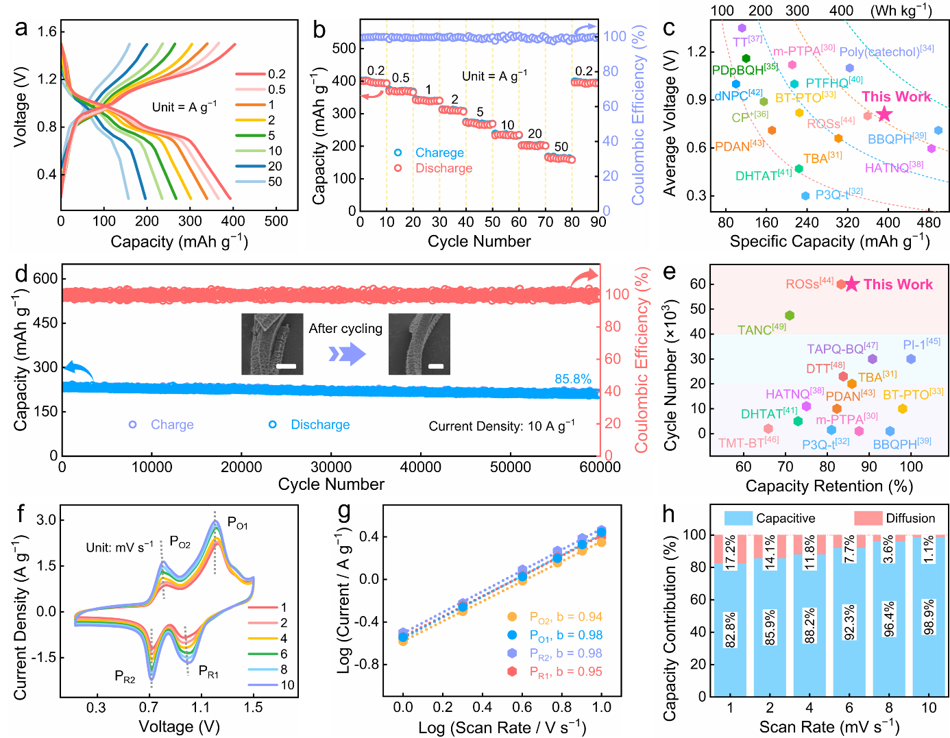 电化学研究表明,OSs电极材料用于水系锌-有机电池时,表现出高容量(393 mAh g−1@0.2 A g−1)、高能量密度(313 Wh kg−1)和优异的循环稳定性(60,000次充放电后容量保持率为85.8%)。