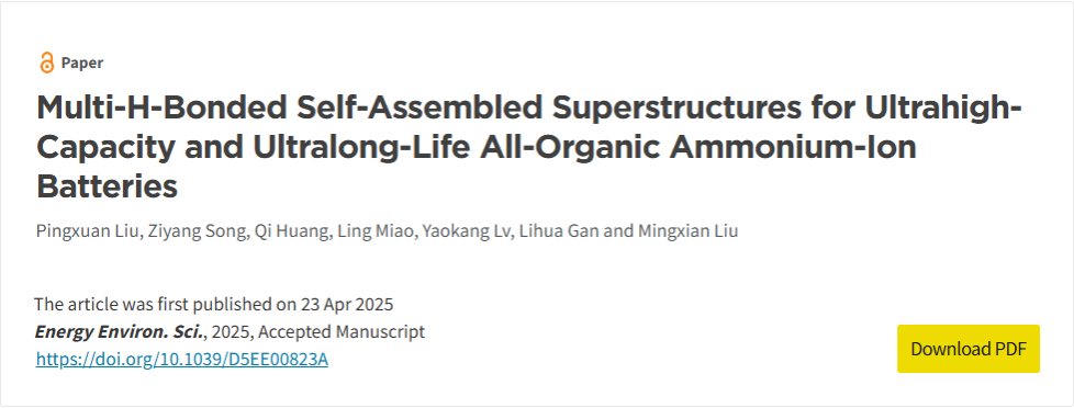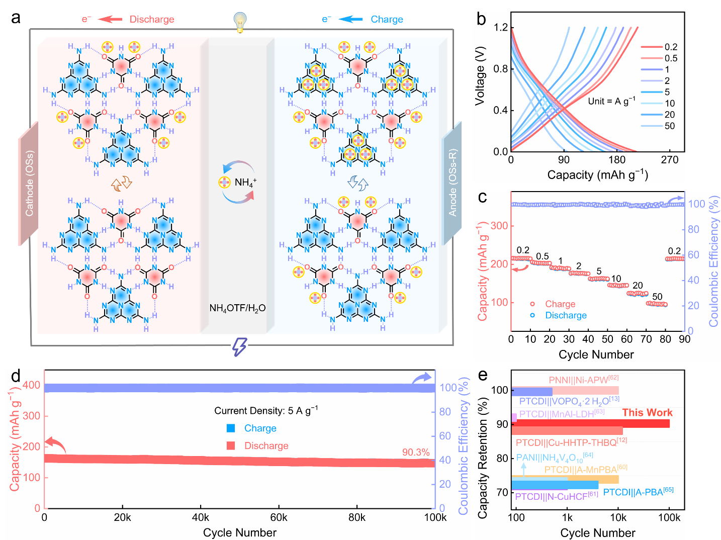 公司甘礼华教授、刘明贤教授团队长期致力于高效储能材料研究并应用于新能源电池开发,课题组近期设计了多重氢键自组装有机超结构(OSs)电极材料,具有低带隙共轭平面结构和长程电子离域路径,在超低活化能下充分利用羰基/亚胺基团实现稳定的15 e− NH4+配位,刷新了全有机电池的容量与循环寿命(213 mAh g−1/100,000次循环)。相关成果以“Multi-H-Bonded Self-Assembled Superstructures for Ultrahigh-Capacity and Ultralong-Life All-Organic Ammonium-Ion Batteries”为题在线发表于国际能源和环境领域权威期刊《能源与环境科学》(Energy & Environmental Science)。