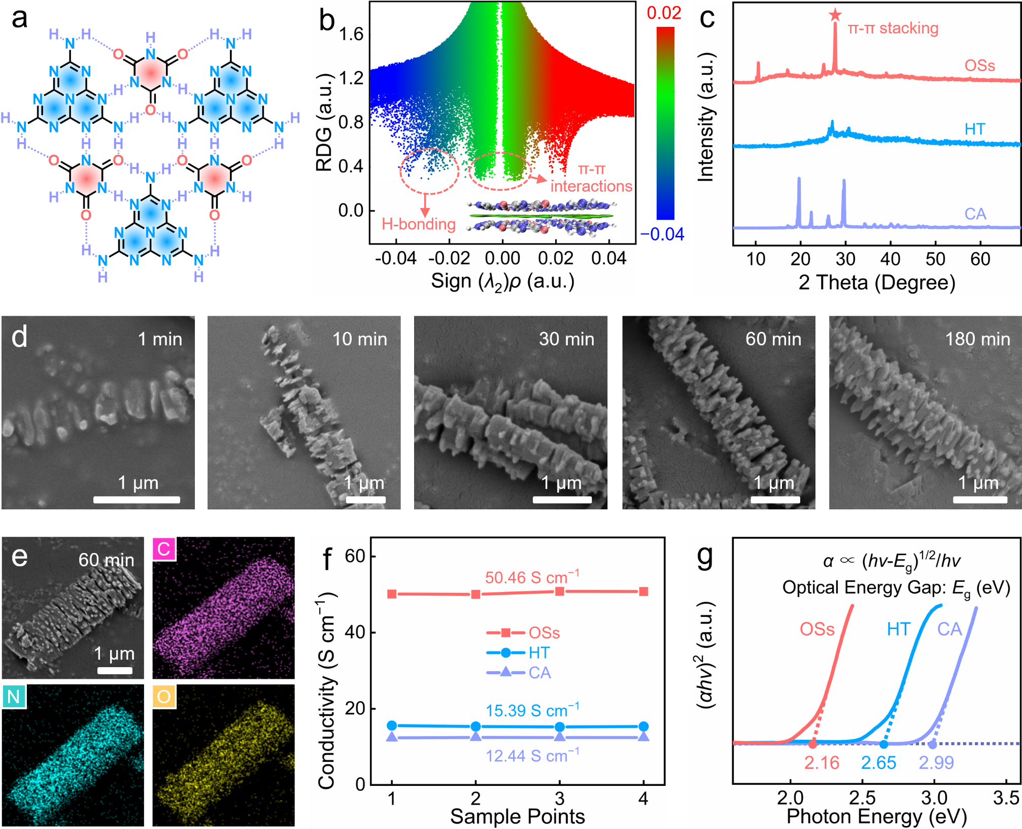 实验表征和理论计算表明,电子给体蜜勒胺受体和电子受体三聚氰酸通过氢键和π−π平面堆叠自组装形成纤维状有机超结构,展示出高密度活性位点、长程低能垒π-电子离域路径和超稳定骨架,有助于加快电子转移动力学和电极氧化还原速率。