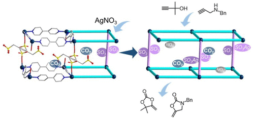 日前,该课题组合成并采用多种有机磺酸类配体构筑了一系列结构新颖、性能各异的磺酸基金属-有机框架材料,在由1,2,4,5-苯四甲磺酸参与构筑的材料TMOF-3中,配体的空间效应使得材料中[Cu(bpy)2]n2n+层间出现配体缺失并形成较大孔隙(~43%)。同时,鉴于磺酸的弱配位性,每个配体中存在两个磺酸根暴露在孔道表面,极大增强了框架对CO2等小分子的结合力。将Ag(I)负载引入孔道制备的TMOF-3-Ag能在极其温和条件下(1个大气压CO2与室温),对炔基小分子发生金属…π活化,并对CO2有高亲和力,该协同作用使CO2固化生成环碳酸酯、恶唑烷酮等高价值化学品。该材料的CO2固化效率远高于常见盐类非均相催化剂,并展现出较好的可循环性。相关成果以“Unusual Missing Linkers in an Organosulfonate-Based Primitive-Cubic (pcu)-Type Metal-Oganic Framework for CO2Capture and Conversion under Ambient Conditions”为题发表于美国化学会旗下催化化学类顶尖期刊ACS Catalysis(IF=10.6)上(ACS Catal., 2018, 8, 2519–2525)。该课题组为唯一完成人,课题组博士生张贵阳为论文第一作者,费泓涵教授为通讯作者。