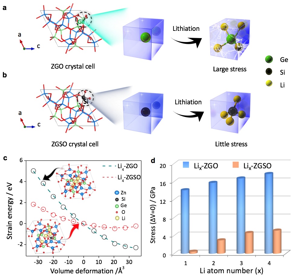 杨金虎教授课题组低应力高性能电池材料研究取得系列进展 当前快速发展的移动电子设备、电动汽车产业和未来智能电网战略,要求发展高性能电池技术作为支撑。然而,电池在充放电过程中,电极材料会产生巨大体变化和结构应力,导致电极材料严重粉碎,造成材料内部、材料与电极之间失去电接触,引起电池性能的全面劣化。针对上述问题,公司杨金虎教授课题组近期通过合理的电极结构设计,发展了一系列低应力、结构稳定的高性能电极材料,实现了电池性能的显著提升。系列研究成果分别发表在国际能源期刊《Advanced Energy Materials》、《Nano Energy》和Cell Press旗下的期刊《iScience》上。 在不久前提出单组份电极材料在纳米尺度上的多壳层协同结构保持和应力缓解机制(Advanced Materials, 2017, 29, 1701494)的基础上,该课题组进而提出了原子尺度的应力缓解策略。利用课题组之前发展的定点取代方法(ACS Nano, 2016, 10, 7882-7891),研究人员利用Si原子定点取代Zn2GeO4(ZGO)纳米线中的Ge原子,成功合成了Zn2(GeO4)0.8(SiO4)0.2(ZGSO)纳米线,所合成的ZGSO作为锂离子电池负极材料时,展现出了较高的比容量和突出的长循环性能。通过非原位XPS分析和密度泛函理论(DFT)嵌锂应力计算,发现Si原子取代的纳米线不仅具有更高的反应活性和理论储锂容量,其独特的原子结构还更有利于缓解锂化过程中所产生的应力,从而保持完整的结构,实现高容量和超长循环寿命。该研究成果日前发表在《Advanced Energy Materials》上(Adv. Energy Mater. 2018, 8, 1702805;影响因子16.72),课题组博生研究生贺婷是第一作者。