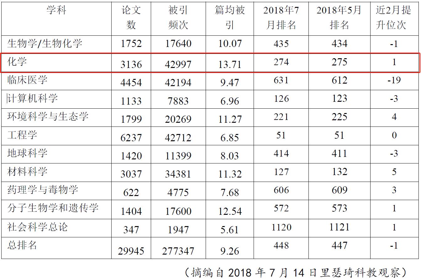 2018年7月ESI国际排名公布,同济化学学科保持上升态势