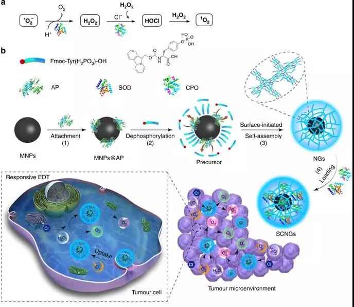癌症仍然是主要的死亡原因,每年在全世界造成数百万人死亡。传统的临床癌症治疗,包括手术、化疗和放射治疗,都有一定的局限性,如对正常细胞的毒副作用、药物/放射耐药性以及肿瘤再生长的发生率增加等。由长期进化而来的人类先天免疫系统,通过分子氧依赖细胞失活溶菌酶相关消化和释放免疫细胞因子,激发了一种新的高效治疗癌症的生物化学方法。中性粒细胞依赖的细胞失活通常发生在几百纳米大小的中性粒细胞溶酶体上,其活性氧(ROS)反应活性由髓过氧化物酶(MPO)、过氧化氢(H2O2)和卤化物离子的生物催化系统决定。 研究人员通过以模拟中性粒细胞溶酶体的形式,将超分子纳米凝胶结构中的级联超氧化物歧化酶(SOD)和氯化物过氧化物酶(CPO)作为模拟中性粒细胞溶酶体,将肿瘤微环境转化为有相对较高水平的ROS,从而构建出多功能SOD/CPO负载纳米凝胶体系(SCNG)用于肿瘤治疗。