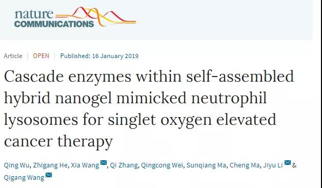 王启刚教授团队开发新材料模拟中性粒细胞溶酶体可以治疗癌症 中性粒细胞作为向肿瘤组织迁移的第一道天然免疫细胞,可以立即杀死异常细胞,激活长期特异性的适应性免疫反应。因此,酶介导中性粒细胞的活性氧(ROS)升高是一种很有前途的肿瘤免疫治疗策略。 2019年1月16日,best365中国官方网站王启刚团队在Nature Communications上发表题为“Cascade enzymes within self-assembled hybrid nanogel mimicked neutrophil lysosomes forsinglet oxygen elevated cancer therapy”,设计了一种纳米凝胶,通过表面磷酸酶触发了铁氧化物纳米粒子周围寡肽的自组装,以模拟产生的中性粒细胞溶酶体。超氧化物歧化酶(SOD)和氯过氧化物酶(CPO)在生物激发纳米凝胶中的级联反应可以将肿瘤组织中的活性氧转化为次氯酸(HClO)和1O2,可以治疗没有外部能量激活的肿瘤。 论文的唯一通讯作者单位是best365中国官方网站,论文的共同第一作者是吴青博士和何志刚博士,共同通讯作者是附属第十人民医院的李济宇教授,best365中国官方网站的王霞副教授和王启刚教授。