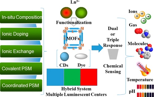 该综述文章比较系统地总结了闫冰教授研究小组近五年来在发展稀土(镧系)功能化金属有机框架结构基元组装杂化材料构建多重发光响应中心的普适性途径及在化学传感方面应用方面的研究进展。作者简单概括了关于功能化的五种主要途径:1)原位复合,2)离子掺杂(取代),3)离子交换,4)共价后合成,5)配位后合成;并给出了其适用的金属有机框架结构基元体系类别。在此基础上,作者重点讨论了产生的多重发光响应中心(主要是双发光响应中心)对于各种典型物种的化学传感研究应用,特别是对于环境与生物体系的特殊标识物的传感识别,获得了一批新颖的高选择性、高灵敏度和结构功能稳定的传感探针体系。结合其简单、方便和有效的有点,该综述进一步探究了基于构筑复杂体系识别的分子逻辑门器件的可能性,为复杂体系的发光化学传感器应用研究提供了有价值的基础性数据。
