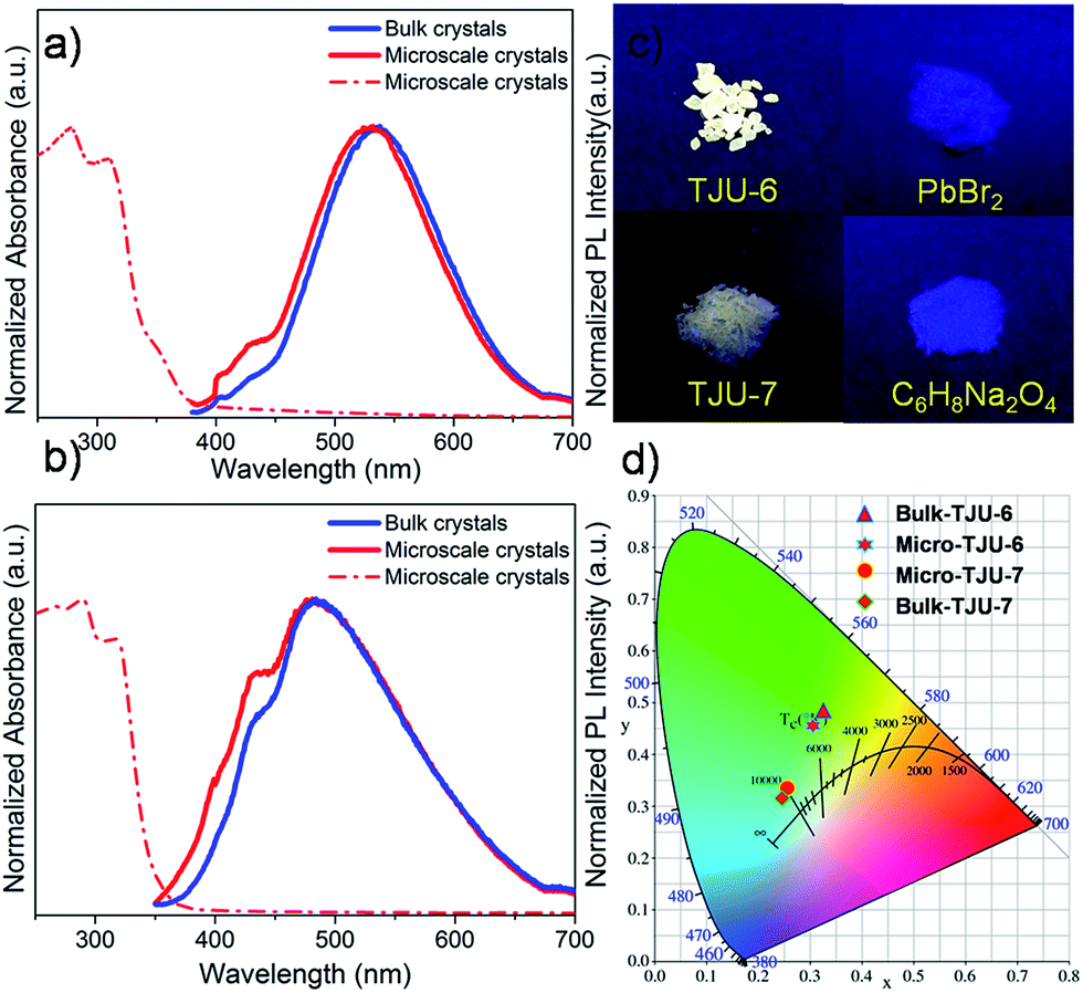 公司费泓涵教授课题组致力于研究阳离子型无机骨架的构建和基于阴离子的应用。近日,该课题组采用有机羧酸盐作为阴离子结构导向剂,实现了两例具有三维阳离子型卤化铅骨架的无机晶格材料。此前已报道为数不多的开式三维卤化铅结构均呈现阴离子型,因此构建这类阳离子型的多孔卤化铅框架具有重要意义并富有挑战性。其中,具有扭曲八面体配位环境的PbII中心对这两例材料的合成和宽谱白光发射性能均起到了至关重要的作用。不同于此前报道的阴离子型卤化铅材料,这类阳离子型三维晶格矩阵具有优异的酸碱稳定性和光热稳定性,有很大潜力取代传统白光LED荧光材料。变温荧光和变温紫外吸收谱(77K~423K)探讨发光机理表明该类材料呈现出随温度变化的光学带宽和明显的激子吸收峰,Varshni方程等拟合计算证实了其非简谐晶格中的强电子-声子耦合作用,从而使高度畸变下的非简谐晶格产生大量的自陷态激子,最终导致本征宽谱白光发射性质。