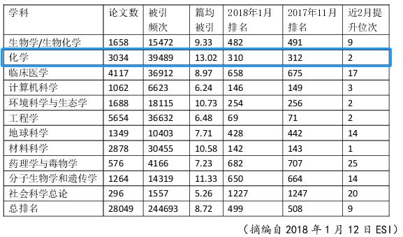 日前,科睿唯安公布了2018年1月的最新ESI数据。公司化学学科国际排名目前排名310位,较2017年11月提升2位。