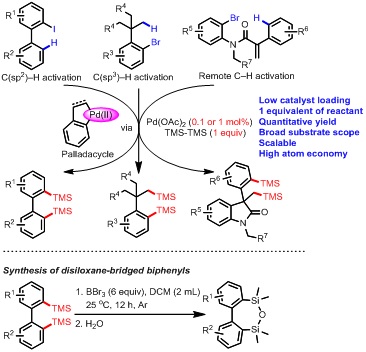 研究人员以卤代芳烃为起始物,过渡金属钯作为催化剂,经过C(sp2)-H或者C(sp3)-H键活化形成环钯络合物,该环钯络合物再与六甲基二硅烷反应得到双硅基化的芳基化产物。在该反应中,仅仅使用千分之一的钯催化剂,一当量的硅试剂,反应就可以得到将近百分之百的产率;六甲基二硅烷的两个三甲基硅烷完全转变成产物,没有形成任何副产物,是典型的原子经济性的有机合成反应。此外,该反应的底物普适性和官能团兼容性非常好,一系列由C(sp2)-H、C(sp3)-H键、和远程C-H键活化形成的环钯络合物可以高效地与硅试剂反应,并形成相应的含有两个三甲基硅烷的反应。该反应设计巧妙、条件简单高效,不仅代表了一系列新颖的有机合成反应,合成的产物在材料科学和药物化学领域也有着重要应用。此外,合成的产物可以进一步转化为二硅氧桥二苯化合物,该化合物在OLED材料领域有着广泛的应用前景。 日前,该课题组作为唯一完成人以“Palladium-Catalyzed C–H Silylation through Palladacycles Generated from Aryl Halides”为题在化学国际权威期刊Angewandte Chemie, International Edition上报道了上述研究成果(Angew. Chem. Int. Ed.2018, DOI: 10.1002/anie.201800330)。张扬会教授为通讯作者,课题组硕士生陆爱兰和博士生季晓明为共同第一作者。该研究工作得到了国家自然科学基金面上项目(21372176、21672162)支持。