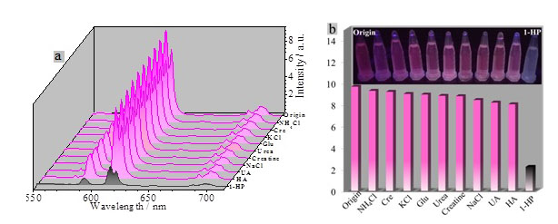 图2. Eu-MOF对1-HP的荧光响应结果及发光响应照片 该工作针对多环芳烃(PAHs)致癌物的生物标志物—尿中1-羟基芘(1-HP),利用荧光共振能量转移原理,设计合成了一个基于Eu功能化MOF的新型纳米荧光探针。作为第一例检测1-HP的荧光探针,它对1-HP表现出优异的传感性能,如选择性好、灵敏度高、检测速度快、循环利用性能好等。此外,他们还基于该探针设计了一款简单、便捷的1-HP尿液检测试纸,该试纸可实现机体对PAHs中毒程度的快速评估。这一快速、灵敏且特异性强的探针有潜力成为诊断PAHs相关疾病强有力的工具。该研究工作获得了国家自然科学基金面上项目(21571142)的资助。 |