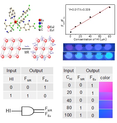 近日,该课题组创新性地设计合成了一种基于双刺激响应型的荧光传感凝胶及浓度依存的逻辑运算装置用于食品变质的实时检测。食品变质不仅会带来巨大的经济损失,更是造成食品安全隐患地最主要原因之一,会给人体健康带来严重危害,因此对食品腐变进行有效的实时监测和检测尤为重要。课题组通过共价修饰将富含羧基的甲基红染料(MR)嫁接到骨架中含有自由氨基(-NH2)的稀土MOFs(EuMOFs)中成功合成传感材料—MR@EuMOFs (ƞ = 48 %),并将此其固定于纤维素水解形成的网状凝胶中组装成传感器件。 MOFs骨架有效的光吸收及对Eu3+和MR的能量传递过程实现了材料双发光中心( FEu和FMR)的集成,且不同的荧光中心对于食品变质产生的挥发性组胺(或pH)含量存在不同的响应特性,促使传感凝胶在紫外灯下发生明显的颜色变化。响应25分钟并线性拟合后,对于组胺的灵敏识别达到0.1 μM。基于以上的变化,将组胺的浓度水平作为输入,两种荧光中心作为输出信号成功构筑了一种1到2的逻辑运算。四种不同层次的浓度组合:NOT (0, 1), YES (1, 0),PASS 1 (1, 1)和PASS 0 (0, 0) 所进行的二进制编码为食品变质的评估提供了由化学反应到分子元件的转化。相关研究成果“A Double-Stimuli-Responsive Fluorescent Center for Monitoring of Food Spoilage based on Dye Covalently Modified EuMOFs: From Sensory Hydrogels to Logic Devices”发表在国际材料科学顶级期刊《Advanced Materials》 (Adv. Mater. 2017, 29, 1702298,期刊影响因子19.791),论文第一作者为该课题组博士生许晓玉。 以上研究为食品变质监测的新型稀土功能化的MOFs荧光器件的设计组装提供了新的途径,为开发此类荧光传感器的分子逻辑计算功能提供了可行的设计方法。该研究工作获得了国家自然科学基金面上项目(21571142)的资助。 |