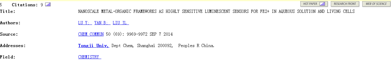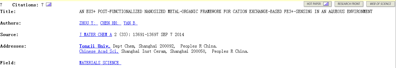 根据5月7日ESI(Essential Science Indicators)更新的数据显示,best365中国官方网站共有7篇论文登上最新的ESI-Hot Paper (last 2 years)排行榜,第一作者单位为best365中国官方网站的有3篇,这3篇论文均由化学系教师贡献。 闫冰老师课题组有2篇入选,分别是“Nanoscale metal-organic frameworks as highly sensitive luminescent sensors for Fe2+in aqueous solution and living cells”(Chem. Commun., 2014,50, 9969-9972)、“An Eu3+post-functionalized nanosized metal-organic framework for cation exchange-based Fe3+-sensing in an aqueous environment”(J. Mater. Chem. A, 2014,2, 13691-13697)。