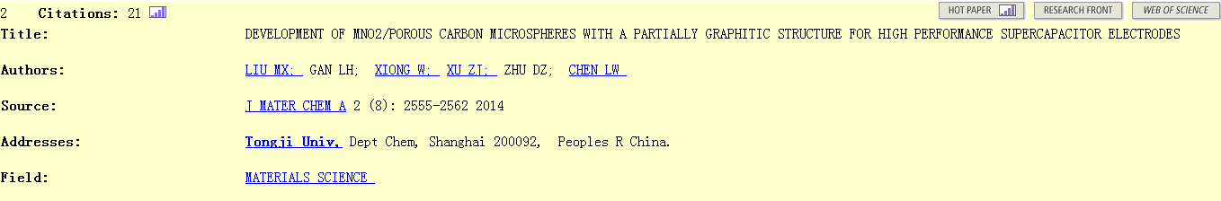 刘明贤、甘礼华老师课题组1篇入选,“Development of MnO2/porous carbon microspheres with a partially graphitic structure for high performance supercapacitor electrodes”(J. Mater. Chem. A, 2014,2, 2555-2562)。