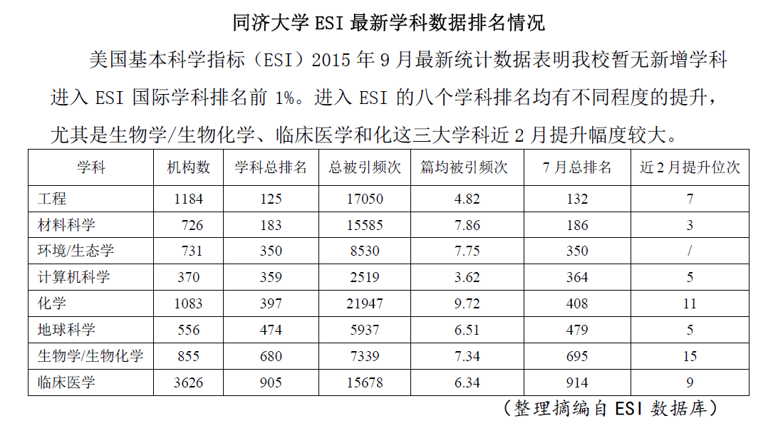 best365中国官方网站发展规划研究中心于9月23日发布的最新一期《发展动态》,在[高等教育评估]专栏中发布文章《best365中国官方网站ESI最新学科数据排名情况》。文章点明,美国基本科学指标(ESI)2015年9月最新统计数据表明公司暂无新增学科进入ESI国际学科排名前1%。文章指出,进入ESI的八个学科排名均有不同程度的提升,尤其是生物学/生物化学、临床医学和化学这三大学科近2月提升幅度较大。其中,化学学科较之两个月前提升11名,详见下图。